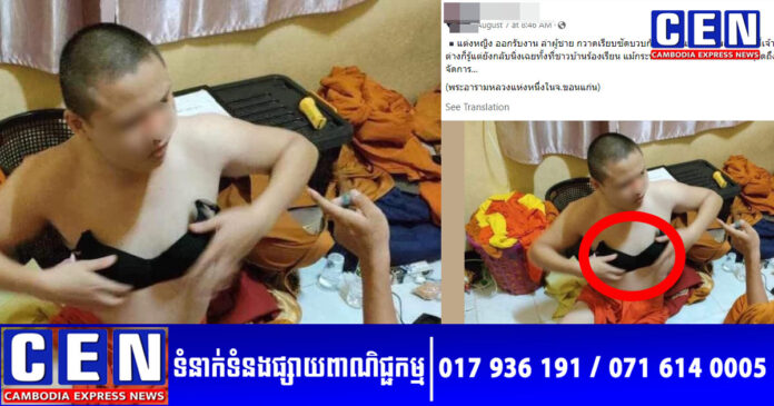 នេះបើតាមទំព័រហ្វេសប៊ុកមួយឈ្មោះថា Eso crush news 2 បានចែករំលែករូបភាពសង្ឃវ័យមួយក្រុមនៅក្នុងបន្ទប់ ក្នុងនោះសង្ឃម្នាក់ លើកក្រណាត់ពណ៌ខ្មៅ ទំនងជាអាវទ្រនាប់ដាក់ផ្អឹបនឹងទ្រូង ដោយភ្ជាប់ Caption យ៉ាងដូច្នេះថា «ស្លៀកពាក់តែងខ្លួនជាស្រី លួចចេញរកស៊ី ដើរប្រមាញ់ប្រុសៗ «បោសសម្អាត» ទាំងលោកនេនៗ និងសង្ឃមួយចំនួននៅក្នុងវត្ត ពិតជាគួរឲ្យហួសចិត្តយ៉ាងខ្លាំង!។ ទង្វើនេះ អាចារ្យទាំងអស់បានដឹង ប៉ុន្តែនៅតែរក្សាភាពស្ងៀមស្ងាត់ បើទោះជាមានការត្អូញត្អែរពីអ្នកភូមិក៏ដោយ។ សូម្បីកូនចៅក្នុងវត្តក៏ងឿងឆ្ងល់ថា ហេតុអ្វីបានជាមិនចាត់វិធានការ…»។