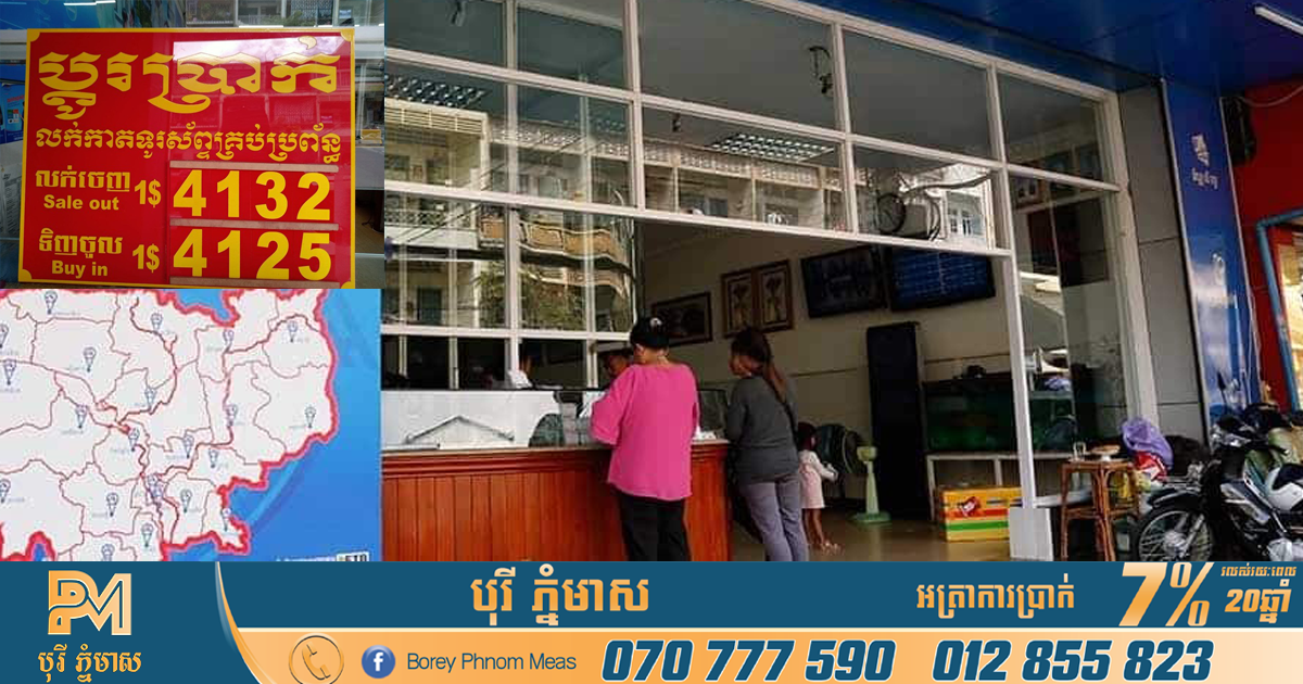បើតាមធនាគារជាតិនៃកម្ពុជាដ៏ដែល អត្រាប្តូរប្រាក់គោលរវាងរូបិយប័ណ្ណផ្សេងៗជាមួយប្រាក់រៀលនៅថ្ងៃទី១២ ខែកញ្ញា ឆ្នាំ២០២៣នេះ អត្រាផ្លូវការ គឺ៤១២៣ រៀល ក្នុងមួយដុល្លារអាមេរិក។