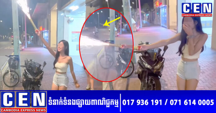 យោងតាមសេចក្តីរាយការណ៍ ហេតុការណ៍នេះបានកើតឡើងនៅព្រឹកព្រលឹមថ្ងៃទី៣០ ខែកញ្ញា នៅលើចិញ្ចើមផ្លូវខាងក្រៅអគារលំនៅដ្ឋានមួយកន្លែង ក្នុងសង្កាត់ Yuan Long ទីក្រុងហុងកុង។ ស្រីស្អាតនោះស្លៀកស៊ិចស៊ី បានឈរនៅខាងមុខផ្ទះ កាន់កាំជ្រួចដុតលេង ដើម្បីភាពសប្បាយរីករាយ ខណៈជុំវិញនាងមានមនុស្សថតលេងសើចយ៉ាងសប្បាយ។