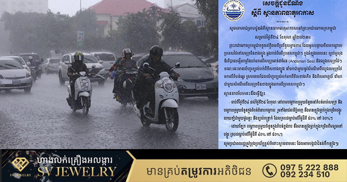 ភ្នំពេញ៖ បើតាមការចេញផ្សាយព័ត៌មានរបស់ក្រសួងធនធានទឹកនិងឧតុនិយម, ស្ថានភាពធាតុអាកាសនៅព្រះរាជាណាចក្រកម្ពុជា ចាប់ពីថ្ងៃទី២៤ ដល់ថ្ងៃទី២៨ ខែតុលា នៅតាមបណ្ដាខេត្តមួយចំនួននៅតំបន់មាត់សមុទ្រ និងបណ្តាខេត្តមួយចំនួនក្នុងតំបន់ទំនាបកណ្តាល រួមទាំងរាជធានីភ្នំពេញ នឹងមានភ្លៀងធ្លាក់ក្នុងកម្រិតបង្គួរ លាយឡំជាមួយផ្គររន្ទះ និងខ្យល់កន្រ្តាក់ ដែលគ្របដណ្ដប់លើផ្ទៃដីពី ៥០% ទៅ ៦០%។
