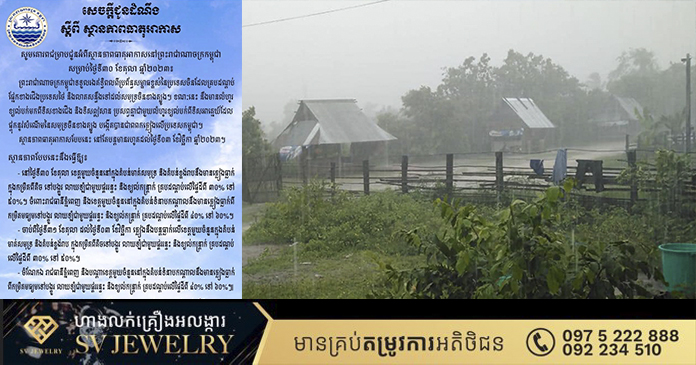 ភ្នំពេញ ៖ ក្រសួងធនធានទឹក និងឧតុនិយម នៅថ្ងៃទី៣០ខែតុលាឆ្នាំ២០២៣នេះ បានចេញសេចក្តីប្រកាសព័ត៌មានស្តីអំពីស្ថានភាពធាតុអាកាស នៅព្រះរាជាណាចក្រកម្ពុជា សម្រាប់ថ្ងៃទី៣០ ខែតុលា ឆ្នាំ២០២៣ ដោយបញ្ជាក់ថា ព្រះរាជាណាចក្រកម្ពុជា ទទួលរងឥទ្ធិពលពីប្រព័ន្ធសម្ពាធខ្ពស់ នៃប្រទេសចិន ដែលគ្របដណ្ដប់ផ្នែកខាងជើងប្រទេសថៃ និងលាតសន្ធឹងទៅដល់សមុទ្រចិនខាងត្បូង។ ខណៈនឹងមានលំហូរខ្យល់បក់មកពីទិសខាងជើង និងទិសឦសាន ប្រសព្វគ្នាជាមួយលំហូរខ្យល់បក់ ពីទិសអាគេ្នយ៍ ដែលផ្ទុកនូវសំណើមនៃសមុទ្រចិនខាងត្បូង បង្កើតបានជាពពកភ្លៀងលើប្រទេសកម្ពុជា។ ស្ថានភាពធាតុអាកាសបែបនេះ នៅតែបន្តមានរហូតដល់ថ្ងៃទី០៣ ខែវិច្ឆិកា ឆ្នាំ២០២៣។