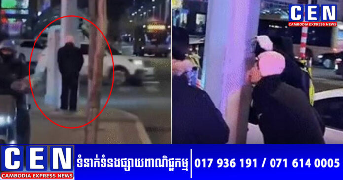 តាមរយៈវីដេអូឃ្លីបដែលថតបានហេតុការណ៍នេះ គេបានរកឃើញថាពេលដែលមានប្រជាពលរដ្ឋល្អ បានទៅពិនិត្យស្ថានភាពនៅក្បែរនោះ ក៏បានឃើញបុរសចម្លែកម្នាក់នោះកំពុងឈរគ្មានចលនាក្នុងអាកាសធាតុត្រជាក់ និងបានរកឃើញគួរឲ្យភ្ញាក់ផ្អើល គឺដោយសារតែអណ្តាតរបស់គាត់ជាប់នៅលើបង្គោលភ្លើង ដែលធ្វើឲ្យគាត់មានអារម្មណ៍ឈឺចាប់យ៉ាងខ្លាំង។ ប៉ុន្តែមិនអាចស្នើសុំជំនួយពីមនុស្សជុំវិញបានទេ។