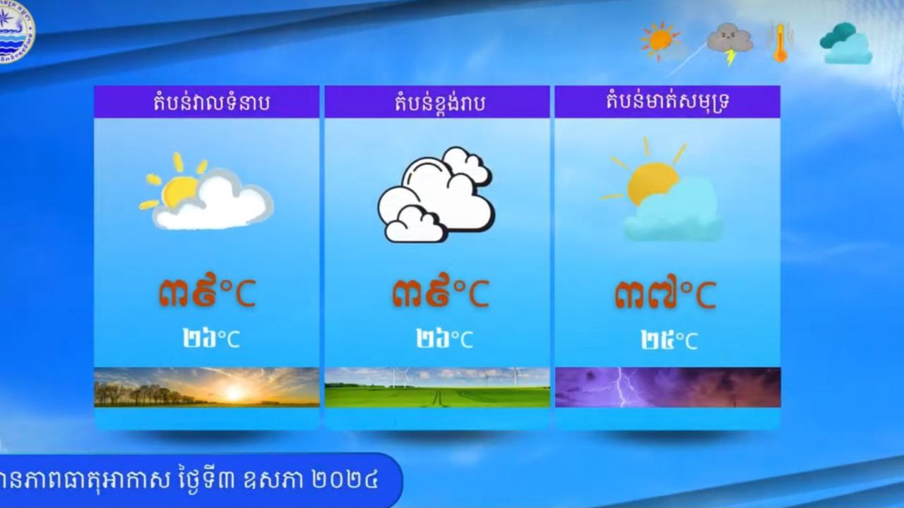 ក្រសួងធនធានទឹក និងឧតុនិយម បានចេញសេចក្តីជូនដំណឹង ស្ដីពីស្ថានភាពធាតុអាកាសនៅកម្ពុជា សម្រាប់ថ្ងៃទី៣ ខែឧសភា ឆ្នាំ២០២៤ អាចមានភ្លៀងធ្លាក់ ផ្គរ ន្ទះ ខ្យល់កន្ត្រាក់ ដោយអន្លើនៅលើផ្ទៃដីប្រមាណ ៤០% ក្នុងប្រទេសកម្ពុជា។