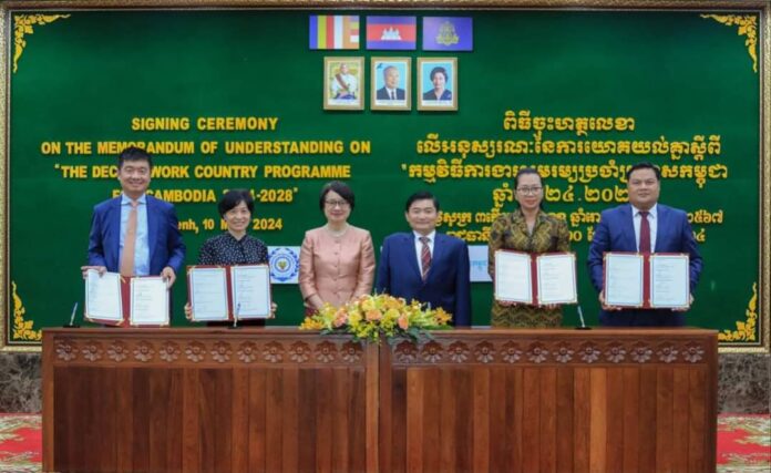 (ភ្នំពេញ)៖ រាជរដ្ឋាភិបាលតំណាងដោយក្រសួងការងារ និងបណ្ដុះបណ្ដាលវិជ្ជាជីវៈ អង្គការអន្តរជាតិខាងការងារ (ILO) តំណាងអង្គការវិជ្ជាជីវៈរបស់កម្មករនិយោជិត និងតំណាងអង្គការវិជ្ជាជីវៈរបស់និយោជក នៅរសៀលថ្ងៃសុក្រ ទី១០ ខែឧសភា ឆ្នាំ២០២៤ បានចុះអនុស្សរណៈនៃការយោគយល់គ្នាលើគម្រោងកម្មវិធីការងារសមរម្យនៅកម្ពុជា ដំណាក់កាលទី៦ ឆ្នាំ២០២៤-២០២៨។ កម្មវិធីដែលប្រារព្ឋនៅទីស្តីការក្រសួងការងារ និងបណ្តុះបណ្តាលវិជ្ជាជីវៈនេះ ធ្វើឡើងក្រោមអធិបតីភាពរបស់ឯកឧត្តម ហេង សួរ រដ្ឋមន្ត្រីក្រសួងការងារ និងបណ្តុះបណ្តាលវិជ្ជាជីវៈ និង លោកស្រី Chihoko Asada-Miyakawa ឧបការរីអគ្គនាយកអង្គការអន្តរជាតិខាងការងារ និងជានាយិកាប្រចាំតំបន់អាស៊ី និងប៉ាស៊ីហ្វិក នៃអង្គការ ILO រួមទាំងតំណាងកម្មករនិយោជិត និងតំណាងសមាគមនិយោជកផងដែរ។