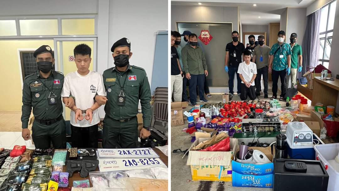 ខេត្តព្រះសីហនុ៖ នគរបាលខេត្តព្រះសីហនុ ដឹកនាំបញ្ជារដោយឯកឧត្តម គួច ចំរើន ប្រធានគណបញ្ជារការឯកភាពខេត្ត បង្រ្កាបបានអាវុធ ចំនួន ៧ដើម និងគ្រឿងញៀន ជាង ៥៨គីឡូក្រាម ឃាត់ខ្លួនជនជាតិចិនម្នាក់ នៅចំណុច សណ្ឋាគារ ជូហេតាង ស្ថិតក្នុងក្រុមទី១៥ ភូមិ៣ សង្កាត់លេខ១ ក្រុងព្រះសីហនុ ខេត្តព្រះសីហនុ កាលពីថ្ងៃទី១០ ខែឧសភា ឆ្នាំ២០២៤៕