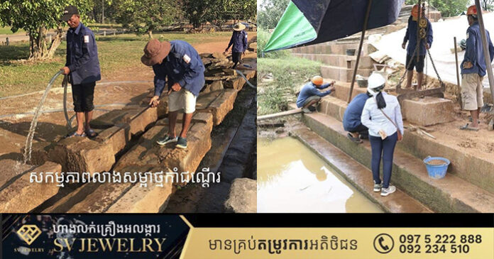 អ្នកជំនាញរូបនេះ បញ្ជាក់ថា ដំបូងគឺត្រូវធ្វើទំនប់ហើយបូមទឹកចេញ ធ្វើសម្រង់ប្លង់ សម្អាតកំណកដី ហើយលើកកាំជណ្តើរថ្មភក់ មកលាងសម្អាត ចុះបញ្ជីថ្ម គូសប្លង់លម្អិតស្ថានភាពដុំថ្មនីមួយៗមុននឹងជួសជុលពង្រឹងថ្មដែលខូចខាត។ ជួសជុលពង្រឹងគ្រឹះ ហើយរៀបកាំជណ្តើរថ្មបាយក្រៀមថ្មីចំនួន៧កាំ ជំនួសថ្មបាយក្រៀមចាស់ដែលខូចខាត។ បន្ទាប់មក រៀបកាំជណ្តើរថ្មភក់ចំនួន៤កាំតាមលំនាំដើមឡើងវិញ។