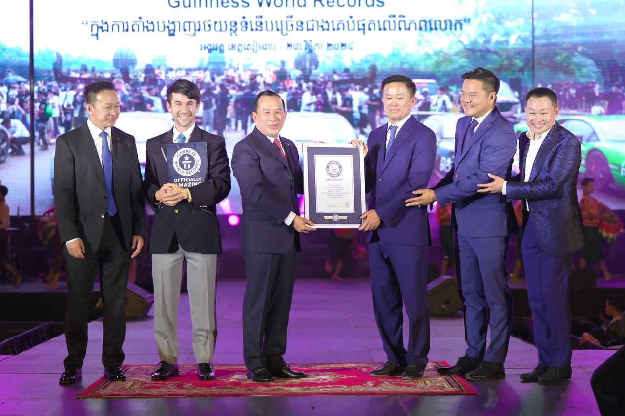 សៀមរាប៖ ស្ថាប័នពិភពលោក Guinness World Records តំណាងដោយលោក AUSTIN JOHNSON បាននាំយកវិញ្ញាបនបត្របញ្ជាក់ពីការបំបែកឯតទគ្គកម្ម «ការតាំងបង្ហាញរថយន្ត SUPER CARS / HYPER CARS ច្រើនជាងគេបំផុតលើពិភពលោក» (THE LARGEST DISPLAY OF SUPER CARS / HYPER CARS) ជូនប្រទេសកម្ពុជាជាផ្លូវការ។ ពិធីប្រគល់ទទួលវិញ្ញាបនបត្រដ៏មហាកិត្តិយសនេះ ធ្វើឡើងក្រោមអធិបតីភាព ឯកឧត្តម ហួត ហាក់ រដ្ឋមន្ត្រីក្រសួងទេសចរណ៍ នារាត្រីថ្ងៃទី២៣ ខែវិច្ឆិកា ឆ្នាំ២០២៤នេះ នៅសួនច្បារមុខព្រះរាជដំណាក់ក្រុងសៀមរាប ខេត្តសៀមរាប។
