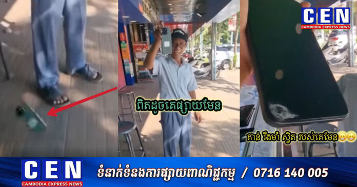 បុរសចំណាស់ម្នាក់បានធ្វើឲ្យមានការភ្ញាក់ផ្អើលយ៉ាងខ្លាំង ខណៈមហាជនគ្រប់គ្នាស្ទើរតែមិនជឿថា គាត់ហ៊ានចំណាយលុយទិញទូរស័ព្ទ១គ្រឿង ដើម្បីធ្វើតេស្តទម្លាក់នៅចំពោះមុខអ្នកលក់ ដើម្បីចង់ថាតើ ទូរស័ព្ទរបស់ក្រុមហ៊ុនមួយហ្នឹង មានគុណភាពតាន់ដូចការផ្សាយពាណិជ្ជកម្មដែរ ឬអត់!?។