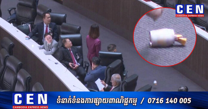 វត្ថុគួរឲ្យសង្ស័យមួយ បានធ្វើឲ្យមានការភ្ញាក់ផ្អើល និងចលាចលតែម្តង បន្ទាប់ពីធ្លាក់នៅកណ្តាលរង្វង់សមាជិកសភាបក្សភឿថៃ ក្នុងអំឡុងពេលប្រជុំសភារួម។ ហើយគេជឿថា វាត្រូវបានគេគ្រវែងចោលមកពីណា ព្រោះមើលទៅលើមានតែពិដានប៉ុណ្ណោះ។