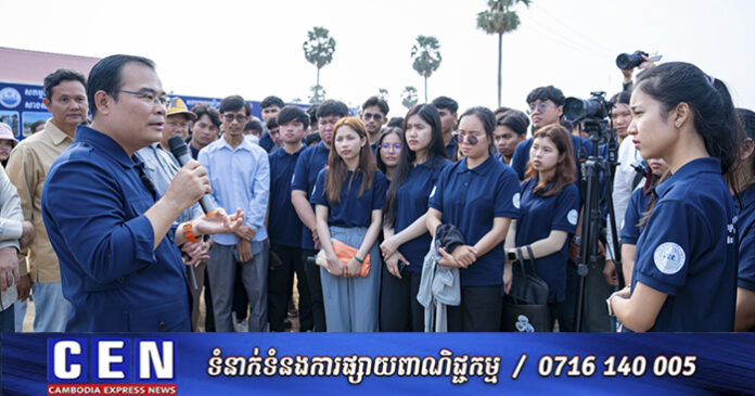 នៅព្រឹកថ្ងៃសុក្រ ទី៧ ខែកុម្ភៈ ឆ្នាំ២០២៥នេះ ឯកឧត្តម ថោ ជេដ្ឋា រដ្ឋមន្ត្រីក្រសួងធនធានទឹក និងឧតុនិយម អមដំណើរដោយឯកឧត្តមជាថ្នាក់ដឹកនាំ មន្ត្រីបច្ចេកទេសក្រសួង និងមន្ទីរធនធានទឹក និងឧតុនិយមខេត្តកណ្តាល និងខេត្តកំពង់ស្ពឺ បានអញ្ជើញដឹកនាំនិស្សិតវិស្វករឆ្នាំទី៤និងទី៥ មុខជំនាញវិស្វកម្មធនធានទឹក និងហេដ្ឋារចនាសម្ព័ន្ធជនបទ ព្រមទាំងសាស្ត្រាចារ្យ នៃវិទ្យាស្ថានបច្ចេកវិទ្យាកម្ពុជា(សាលាតិចណូ)ប្រមាណ ១២០នាក់ ធ្វើទស្សនកិច្ចសិក្សាស្វែងយល់ពីប្រព័ន្ធរំដោះទឹក និងពង្វាងទឹកជំនន់ចេញពីរាជធានីភ្នំពេញ នៅទីតាំងអនុវត្តគម្រោងតំបន់រលាំងជ្រៃ និងតំបន់ស្ទឹងតូច ក្នុងភូមិសាស្រ្តខេត្តកំពង់ស្ពឺ។