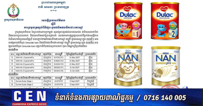 ក្រសួងសុខាភិបាល នៃព្រះរាជាណាចក្រកម្ពុជា សូមជម្រាបជូនដល់សាធារណជន ជាពិសេសមាតាបិតា និងអាណាព្យាបាលទារក និងកុមារទាំងអស់ឱ្យបានជ្រាបថា យោងតាមការផ្សព្វផ្សាយរបស់ទីភ្នាក់ងារសុវត្ថិភាព ចំណីអាហារនៃប្រទេសសិង្ហបុរី បានបញ្ជាក់ថាផលិតផលទឹកដោះគោម្សៅ ៥ឡូតិ៍ ដូចមានឈ្មោះក្នុង តារាងទី១ អាច មានវត្តមានជាតិពុល Cereulide toxin និងផលិតផលទឹកដោះគោម្សៅ ២ឡូតិ៍ ដូចមានឈ្មោះក្នុង តារាងទី២ មាន វត្តមានជាតិពុល Cereulide toxin បង្កហានិភ័យដល់សុខភាពទារក កុមារ និងអ្នកប្រើទូទៅផងដែរ៖