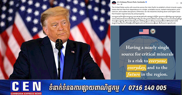 ភ្នំពេញ ៖ ស្ថានទូតសហរដ្ឋអាមេរិកប្រចាំកម្ពុជា នៅថ្ងៃទី១០ខែកុម្ភៈឆ្នាំ២០២៦នេះ បានចេញផ្សាយព័ត៌មានថា សហរដ្ឋអាមេរិកធ្វើការជាមួយប្រទេសនានាទូទាំងតំបន់ឥណ្ឌូប៉ាស៊ីហ្វិក ក្នុងការបង្កើតខ្សែសង្វាក់ផ្គត់ផ្គង់ធនធានរ៉ែសំខាន់ៗ ដែលមិនពឹងផ្អែកលើប្រភពតែមួយដែលមិនអាចទុកចិត្តបាន ការកេងចំណេញទីផ្សារ ការបង្ខិតបង្ខំតម្លៃ និងការរំខានភ្លាមៗ។