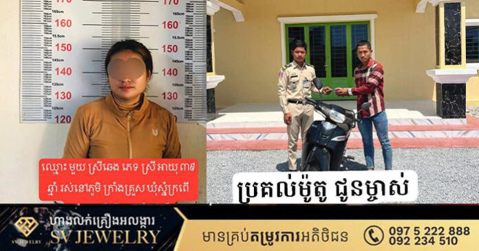 ដោយបានការបញ្ជាដឹកនាំដ៏ខ្ពង់ខ្ពស់ពីលោកឧត្ដមសេនីយ៍ទោ ឃឹម សុកខៃ ស្នងការនគរបាលខេត្ដកំពង់ស្ពឺ និងការណែនាំពីលោកស្នងការរងផែនការងារនគរបាលព្រហ្មទណ្ឌខេត្ដ កំលាំងអធិការដ្ឋាននគរបាលស្រុកគងពិសីដឹកនាំផ្ទាល់ដោយលោកវរសេនីយ៍ឯក យ៉ាង សុខលី អធិការនគរបាលស្រុកគងពិសី បានសហការធ្វេីការស្រាវជ្រាវរហូតឈានទៅកំណត់បានមុខសញ្ញាជនសង្ស័យជាចោរលួចម៉ូតូខាងលេី នៅថ្ងៃទី១៨ ខែកុម្ភៈ ឆ្នាំ២០២៦ សមត្ថកិច្ចបានឃាត់ឈ្មោះ មួយ ស្រីឆេង ភេទស្រី អាយុ ៣៨ឆ្នាំ រស់នៅភូមិក្រាំងគ្រួស ឃុំស្នំក្រពើ ស្រុកគងពិសី ខេត្តកំពង់ស្ពឺ យកមកសួរនាំ និងបានដកហូតម៉ូតូ១គ្រឿងរបស់ជនរងគ្រោះត្រឡប់មកវិញ។