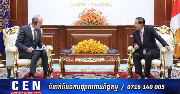 ភ្នំពេញ ៖ នៅវិមានសាមគ្គីភាព នៃព្រឹទ្ធសភា នាព្រឹកថ្ងៃព្រហស្បតិ៍ ២រោច ខែផល្គុន ឆ្នាំម្សាញ់ សប្តស័ក ពុទ្ធសករាជ ២៥៦៩ ត្រូវនឹងថ្ងៃទី៥ ខែមីនា ឆ្នាំ២០២៦ សម្តេចអគ្គមហាសេនាបតីតេជោ ហ៊ុន សែន ប្រមុខរដ្ឋស្តីទីនៃព្រះរាជាណាចក្រកម្ពុជា បានអនុញ្ញាតឱ្យ លោក ភីតធឺ អាល់មែន (Peter Altmann) សមាជិកក្រុមប្រឹក្សាភិបាលនៃគណបក្ស AfD មូលដ្ឋាន ប្រចាំទីក្រុង Karlsruhe ប្រទេសអាល្លឺម៉ង់ ចូលជួប សម្ដែងការគួរសម និងពិភាក្សាការងារ។