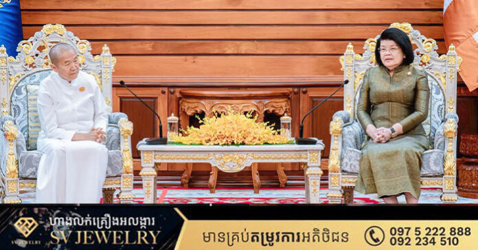 ភ្នំពេញ ៖ សម្តេចមហារដ្ឋសភាធិការធិបតី ឃួន សុដារី ប្រធានរដ្ឋសភានៅព្រឹកថ្ងៃទី៥ ខែមីនា ឆ្នាំ២០២៦ បានទទួលជួបសវនាការជាមួយ ប្រតិភូមជ្ឈមណ្ឌលវប្បធម៌ ព្រះពុទ្ធសាសនាកម្ពុជាដឹកនាំដោយ អ្នកឧកញ៉ា អគ្គមហាឧបាសិកាធម្មបណ្ឌិត ញ៉ឹក ប៊ុនថា ប្រធានមជ្ឈមណ្ឌលនិងជាប្រធាននាទីស្វែងយល់ព្រះពុទ្ធសាសនា នៅវិមានរដ្ឋសភា ក្នុងឱកាសអបអរសាទរទិវាអន្តរជាតិនារី ៨ មីនា លើកទី១១៥ ដែលនឹងឈានចូលមកដល់នៅប៉ុន្មានថ្ងៃទៀតនេះ។