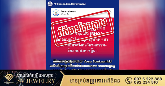 ភ្នំពេញ ៖ ព័ត៌មានក្លែងក្លាយ: ទាហានបញ្ជាការដ្ឋានអង្គរក្ស (BHQ) បានលួចចូលប្រទេសថៃ និងសម្រុកចូលទីក្រុងបាងកកដើម្បីស៊ើបការណ៍ ព្រមទាំងព្រមានឱ្យប្រុងប្រយ័ត្នចំពោះការបង្កវិនាសកម្ម និងការលួចធ្វើឃាតថ្នាក់ដឹកនាំថៃ។