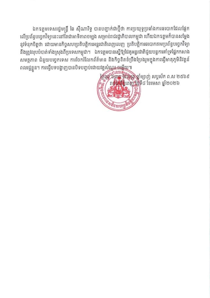 ឯកឧត្តមទេសរដ្ឋមន្ត្រី បានគូសបញ្ជាក់ថា ច្បាប់នេះបង្កើតជាក្របខ័ណ្ឌច្បាប់មួយជាក់លាក់ដែលមានកំណត់ពីបទល្មើសច្បាស់លាស់ និងទោសទណ្ឌធ្ងន់ធ្ងរ។ឯកឧត្តមបានគូសបញ្ជាក់ពីវឌ្ឍនភាពនៃយុទ្ធនាការទូទាំងប្រទេសរបស់កម្ពុជាប្រឆាំងនឹងការឆបោកតាមប្រព័ន្ធបច្ចេកវិទ្យាចាប់តាំងពីខែកក្កដាឆ្នាំ២០២៥ មក។