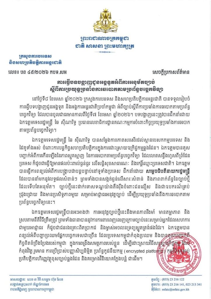 ភ្នំពេញ៖ នៅព្រឹកថ្ងៃទី៨ ខែមេសា ឆ្នាំ២០២៦ ក្រសួងការបរទេស និងសហប្រតិបត្តិការអន្តរជាតិ បានទទួលរៀបចំការធ្វើបទបង្ហាញជូនអង្គទូត និងអង្គការអន្តរជាតិប្រចាំនៅកម្ពុជា នៅទីស្តីការក្រសួង អំពីច្បាប់ស្តីពីការប្រឆាំងការឆបោកតាមប្រព័ន្ធបច្ចេកវិទ្យា។
