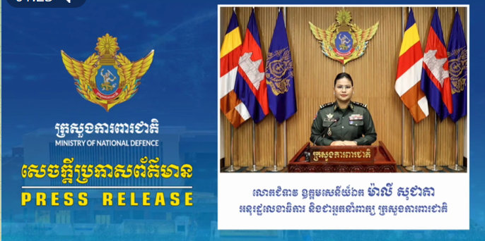 លោកជំទាវ ឧត្តមសេនីយ៍ឯក ម៉ាលី សុជាតា អ្នកនាំពាក្យក្រសួងការពារជាតិ នៃព្រះរាជាណាចក្រកម្ពុជា សូមជម្រាបជូនសាធារណជន អ្នកសារព័ត៌មានជាតិ និងអន្តរជាតិនៅថ្ងៃទី១៥ ខែមេសា ឆ្នាំ២០២៦មេត្តាជ្រាបថា៖ អ្នកនាំពាក្យក្រសួងការពារជាតិ សម្តែងនូវការខកចិត្តយ៉ាងខ្លាំង និងសូមបដិសេធចំពោះព័ត៌មានដែលបានផ្សព្វផ្សាយតាមបណ្តាញសង្គម និងសារព័ត៌មានរបស់ថៃជាបន្តបន្ទាប់ ដែលថា «កម្ពុជាស្នើឱ្យបើកច្រកដឹកជញ្ជូនទំនិញសង្គ្រោះបន្ទាន់» ដោយនេះជាព័ត៌មានក្លែងក្លាយ និងផ្ទុយពីការពិតក្នុងចេតនា ដើម្បីបង្កការបំភ័ន្តសាធារណមតិជាតិ និងអន្តរជាតិ។