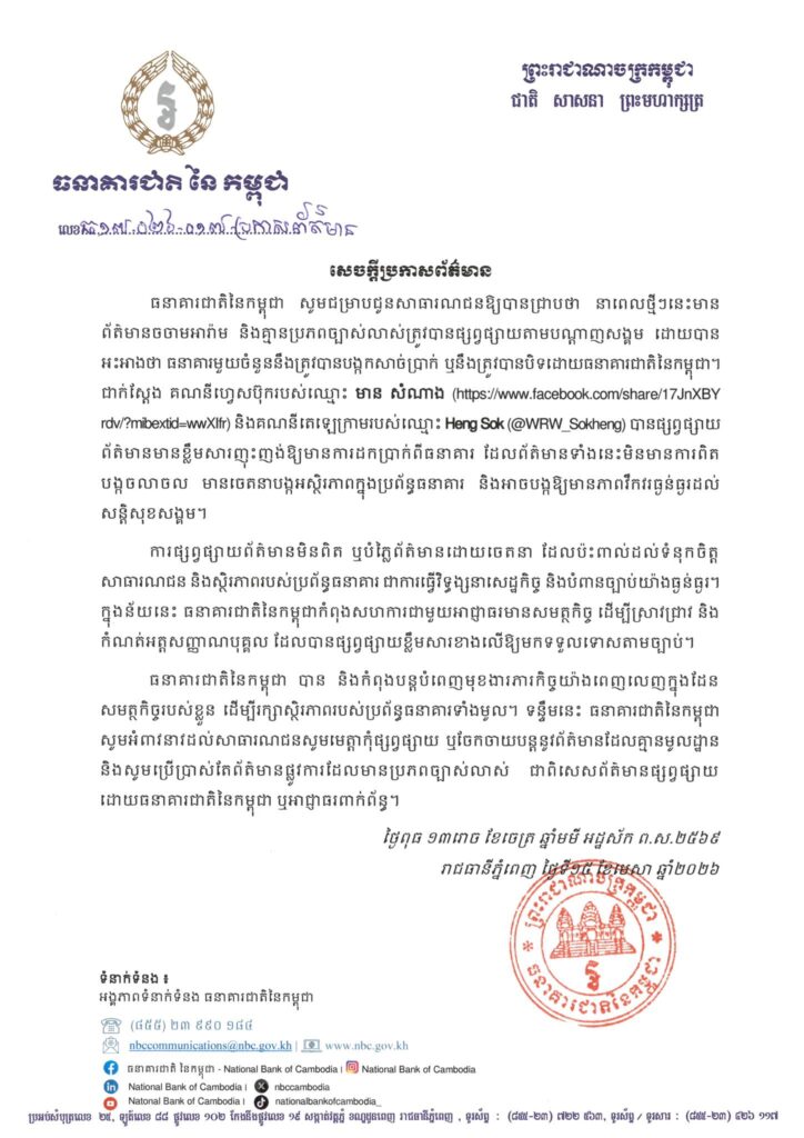 ធនាគារជាតិនៃកម្ពុជា សូមជម្រាបជូនសាធារណជនឱ្យបានជ្រាបថា នាពេលថ្មីៗនេះមាន ព័ត៌មានចចាមអារ៉ាម និងគ្មានប្រភពច្បាស់លាស់ត្រូវបានផ្សព្វផ្សាយតាមបណ្តាញសង្គម ដោយបាន អះអាងថា ធនាគារមួយចំនួននឹងត្រូវបានបង្កកសាច់ប្រាក់ ឬនឹងត្រូវបានបិទដោយធនាគារជាតិនៃកម្ពុជា។ ជាក់ស្តែង គណនីហ្វេសប៊ុករបស់ឈ្មោះ មាន សំណាង (https://www.facebook.com/share/17JnXBY rdv/?mibextid=wwXIfr) និងគណនីតេឡេក្រាមរបស់ឈ្មោះ Heng Sok (@WRW_Sokheng) បានផ្សព្វផ្សាយ ព័ត៌មានមានខ្លឹមសារញុះញង់ឱ្យមានការដកប្រាក់ពីធនាគារ ដែលព័ត៌មានទាំងនេះមិនមានការពិត បង្កចលាចល មានចេតនាបង្កអស្ថិរភាពក្នុងប្រព័ន្ធធនាគារ និងអាចបង្កឱ្យមានភាពវឹកវរធ្ងន់ធ្ងរដល់សន្តិសុខសង្គម។