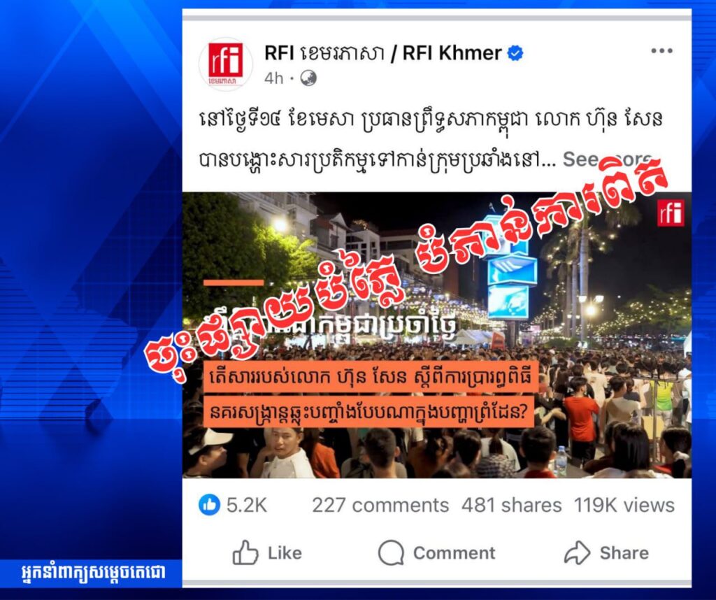 ភ្នំពេញ៖ឯកឧត្តម ជា ធីរិទ្ធ អ្នកនាំពាក្យសម្តេចតេជោ បានថ្លែងថា ក្នុងនាមអ្នកនាំពាក្យសម្តេចតេជោ ខ្ញុំសូមច្រានចោលនូវខ្លឹមសាររបស់វិទ្យុបារាំង RFI នៅថ្ងៃទី ១៥ ខែមេសាឆ្នាំ ២០២៦ ដែលបានចុះផ្សាយថា សម្តេចតេជោ បានលុបសាររបស់លោកកាលពីថ្ងៃទី១៤ ខែមេសា ឆ្នាំ២០២៦ នៅលេីទំព័រហ្វេសប៊ុកផ្លូវការរបស់សម្តេច។ ខ្ញុំសូមបញ្ជាក់ថា នេះជាការចុះផ្សាយដោយខុសពីការពិតរបស់វិទ្យុបារាំងអន្តរជាតិ RFI ដែលធ្វេីឲ្យសាធារណជនភ័ន្តច្រឡំ។ ខ្ញុំសូមស្នេីឲ្យវិទ្យុ RFI កែតម្រូវជាបន្ទាន់។