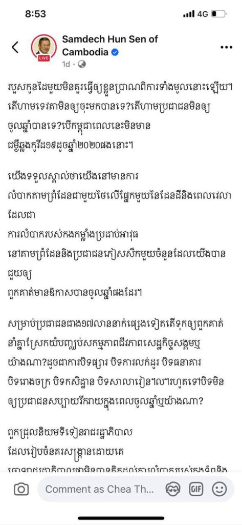 អ្នកនាំពាក្យសម្តេចតេជោ សូមជម្រាបជូនសាធារណជន ជ្រាបថា សាររបស់សម្តេចតេជោ ដែលបានបង្ហោះនៅលើបណ្តាញសង្គមហ្វេសបុក កាលពីថ្ងៃទី ១៤ មេសា ឆ្នាំ ២០២៦ ដេីម្បីពន្យល់ពលរដ្ឋពីការរៀបចំពិធីបុណ្យចូលឆ្នាំ មិនបានលុបចោលឡេីយ។ សូមជនរួមជាតិជ្រាបថា សម្តេចតេជោ គ្មានទម្លាប់លុបសារដែលលោកបង្ហោះពន្យល់ពលរដ្ឋនោះទេ។