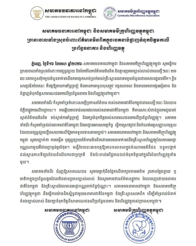ភ្នំពេញ, ថ្ងៃទី១៦ ខែមេសា ឆ្នាំ២០២៦–សមាគមធនាគារនៅកម្ពុជា និងសមាគមមីក្រូហិរញ្ញវត្ថុកម្ពុជា សូមធ្វើការ ច្រានចោលទាំងស្រុងចំពោះការផ្សព្វផ្សាយ និងចែករំលែកព័ត៌មានមិនពិត និងគ្មានប្រភពច្បាស់លាស់នាពេលថ្មីៗនេះ តាម រយៈផេកហ្វេសប៊ុកមួយចំនួនទាក់ទងនឹងការបង្កកសាច់ប្រាក់របស់គ្រឹះស្ថានធនាគារមួយចំនួនដោយសហរដ្ឋអាម៉េរិក។ សារប្រឌិតបែបនេះ គឺបង្កឱ្យមានការភ័ន្តច្រឡំ មិនមានការទទួលខុសត្រូវ បង្កចលាចល និងមានចេតនាបង្កអស្ថិរភាព និង បំផ្លាញទំនុកចិត្ដសាធារណជនមកលើប្រព័ន្ធធនាគារ និងហិរញ្ញវត្ថុនៅកម្ពុជា។