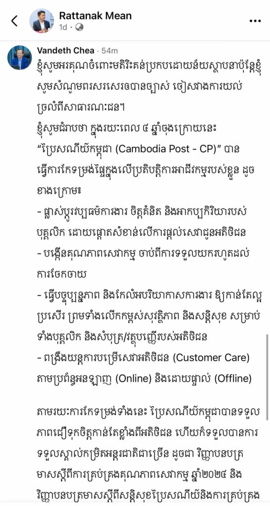 ការលើកឡើងរបស់ ឯកឧត្តមរដ្ឋមន្រ្តី ជា វ៉ាន់ដេត ឆ្លើយអ្នកប្រើប្រាស់បណ្តាញសង្គមមួយរូប ដែលបានសរសេររិះគន់ទៅលើមន្រ្តីប្រៃសណីយ៍កម្ពុជា ដែលខ្លួនយល់ថា មន្រ្តីប្រៃសណីយ៍កម្ពុជា បម្រើសេវាកម្មអតិថិជនមិនបានល្អ និងមានបំណងគេងចំណេញលើខ្លួន។