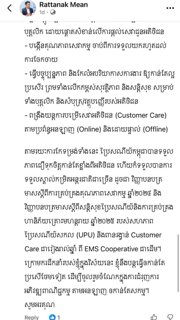ឯកឧត្តមបានបញ្ជាក់បន្ថែមថា តាមរយៈការកែទម្រង់ទាំងនេះ ប្រៃសណីយ៍កម្ពុជាបានទទួលភាពជឿទុកចិត្តកាន់តែខ្លាំងពីអតិថិជន ហើយក៏ទទួលបានការទទួលស្គាល់កម្រិតអន្តរជាតិជាច្រើន ដូចជា វិញ្ញាបនបត្រមាសស្តីពីការគ្រប់គ្រងគុណភាពសេវាកម្ម ឆ្នាំ២០២៤ និង វិញ្ញាបនបត្រមាសស្តីពីសន្តិសុខប្រៃសណីយ៍និងការគ្រប់គ្រងហានិភ័យគ្រោះមហន្តរាយ ឆ្នាំ២០២៥ របស់សហភាពប្រៃសណីយ៍សកល (UPU) និងពានរង្វាន់ Customer Care ជារៀងរាល់ឆ្នាំ ពី EMS Cooperative ជាដើម។