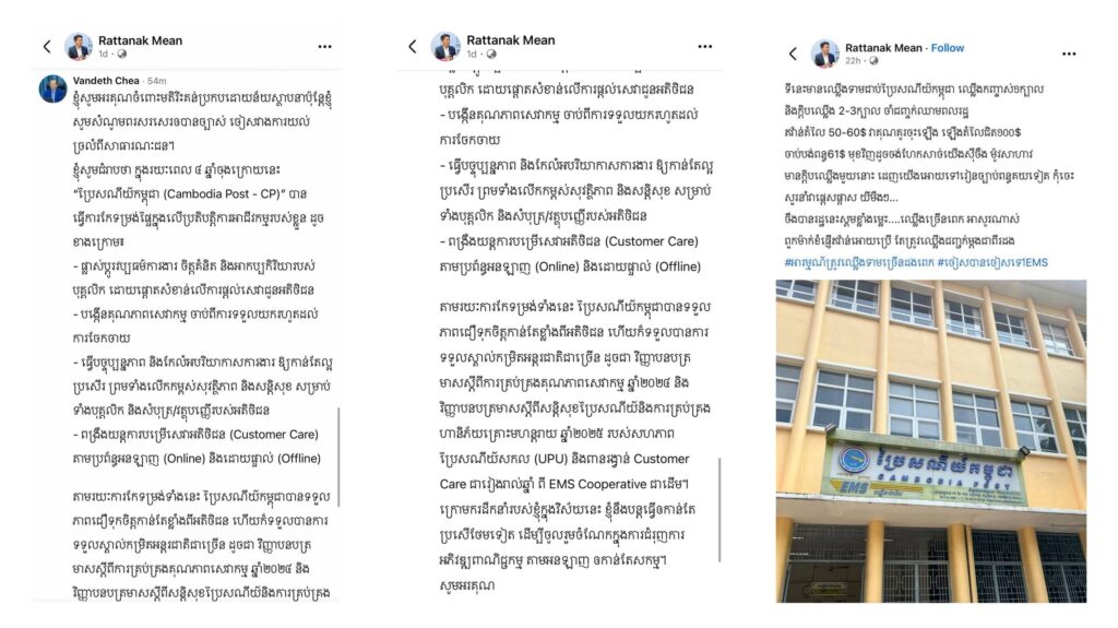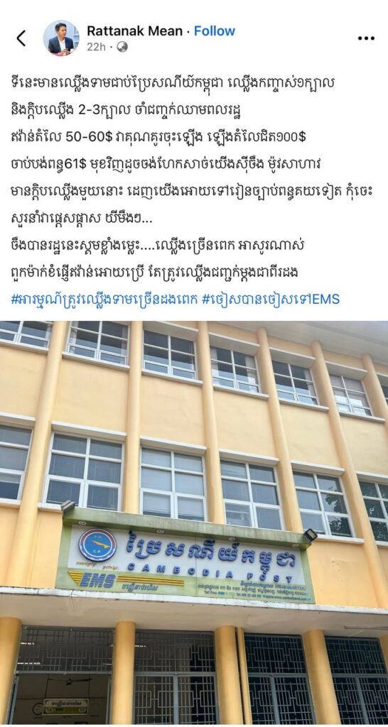 អ្នកប្រើប្រាស់បណ្តាញសង្គមរូបនេះបានសរសេរយ៉ាងដូច្នេះថា «ទីនេះមានឈ្លើងទាមជាប់ប្រៃសណីយ៍កម្ពុជា ឈ្លើងកញ្ចាស់១ក្បាលនិងក្តិបឈ្លើង ២-៣ក្បាល ចាំជញ្ចក់ឈាមពលរដ្ឋ ,ឥវ៉ាន់តំលៃ ៥០-៦០ដុល្លារ វាគុណគូរចុះឡើង ឡើងតំលៃជិត១០០ដុល្លារ ចាប់បង់ពន្ធ៦១ដុល្លារ មុខវិញដូចចង់ហែកសាច់យើងស៊ីចឹង ម៉ូវសាហាវ មានក្តិបឈ្លើងមួយនោះ ដេញយើងឱ្យទៅរៀនច្បាប់ពន្ធគយទៀត កុំចេះសួរនាំវាផ្តេសផ្តាស យីមឹងៗ ចឹងបានរដ្ឋនេះស្គមខ្លាំងម្លេះ….ឈ្លើងច្រើនពេក អាសូរណាស់។ ពួកម៉ាក់ខំផ្ញើឥវ៉ាន់អោយប្រើ តែត្រូវឈ្លើងជញ្ជក់ម្តងជាពីរដង»។