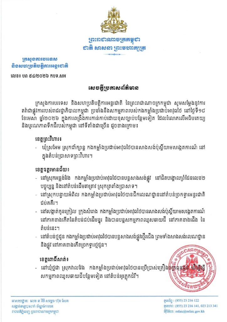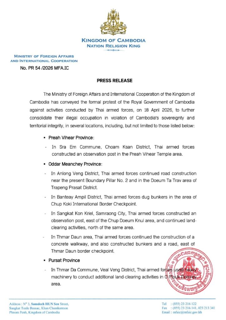 រាជធានីភ្នំពេញ ៖ នៅថ្ងៃទី១៩ ខែមេសា ឆ្នាំ២០២៦ក្រសួងការបរទេស និងសហប្រតិបត្តិការអន្តរជាតិ នៃព្រះរាជាណាចក្រកម្ពុជា សូមសម្តែងនូវការ តវ៉ាជាផ្លូវការរបស់រាជរដ្ឋាភិបាលកម្ពុជា ប្រឆាំងនឹងសកម្មភាពរបស់កងកម្លាំងប្រដាប់អាវុធថៃ នៅថ្ងៃទី១៨ ខែមេសា ឆ្នាំ២០២៦ ក្នុងការពង្រឹងការកាន់កាប់ដោយខុសច្បាប់បន្ថែមទៀត ដែលរំលោភលើអធិបតេយ្យ និងបូរណភាពទឹកដីរបស់កម្ពុជា នៅទីតាំងជាច្រើន ដូចខាងក្រោម៖