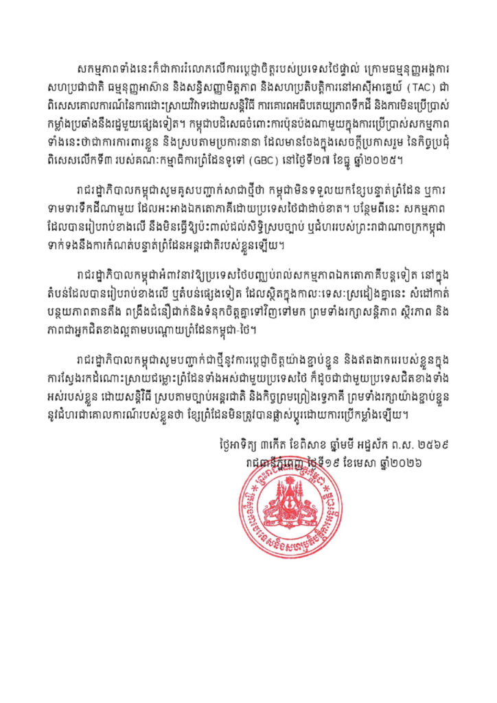 រាជរដ្ឋាភិបាលកម្ពុជាសូមគូសបញ្ជាក់សាជាថ្មីថា កម្ពុជាមិនទទួលយកខ្សែបន្ទាត់ព្រំដែន ឬការ ទាមទារទឹកដីណាមួយ ដែលអះអាងឯកតោភាគីដោយប្រទេសថៃជាដាច់ខាត។ បន្ថែមពីនេះ សកម្មភាព ដែលបានរៀបរាប់ខាងលើ នឹងមិនធ្វើឱ្យប៉ះពាល់ដល់សិទ្ធិស្របច្បាប់ ឬជំហររបស់ព្រះរាជាណាចក្រកម្ពុជា ទាក់ទងនឹងការកំណត់បន្ទាត់ព្រំដែនអន្តរជាតិរបស់ខ្លួនឡើយ។
