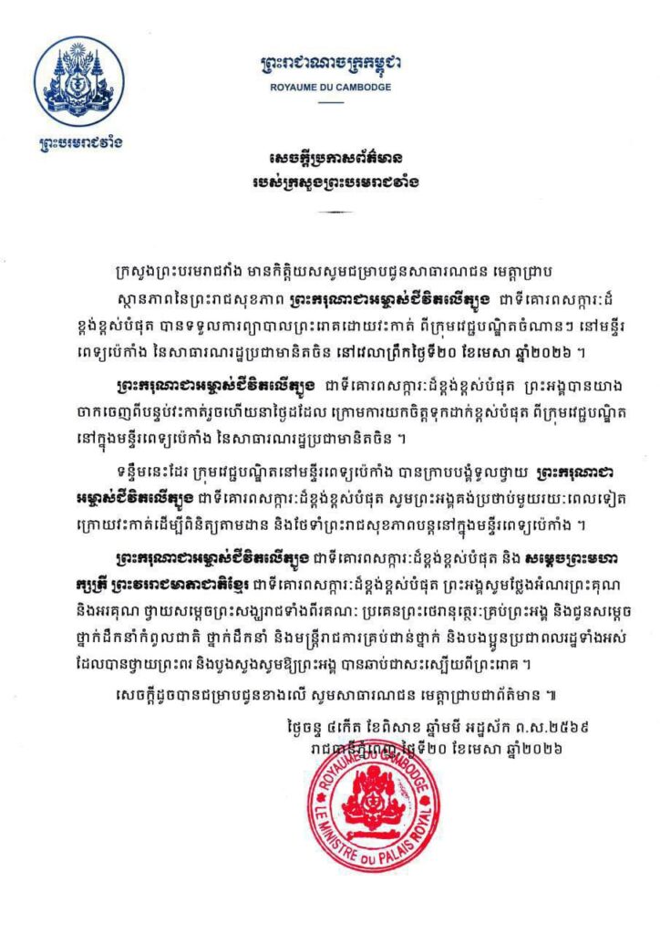 នៅថ្ងៃចន្ទ ៤កើត ខែពិសាខ ឆ្នាំមមី អដ្ឋស័ក ព.ស.២៥៦៩ ទី២០ ខែមេសា ឆ្នាំ២០២៦ក្រសួងព្រះបរមរាជវាំង មានកិត្តិយសសូមជម្រាបជូនសាធារណជន មេត្តាជ្រាប ស្ថានភាពនៃព្រះរាជសុខភាព ព្រះករុណាជាអម្ចាស់ជីវិតលើត្បូង ជាទីគោរពសក្ការៈដ៏ ខ្ពង់ខ្ពស់បំផុត បានទទួលការព្យាបាលព្រះរោគដោយវះកាត់ ពីក្រុមវេជ្ជបណ្ឌិតចំណានៗ នៅមន្ទីរ ពេទ្យប៉េកាំង នៃសាធារណរដ្ឋប្រជាមានិតចិន នៅវេលាព្រឹកថ្ងៃទី២០ ខែមេសា ឆ្នាំ២០២៦ ។