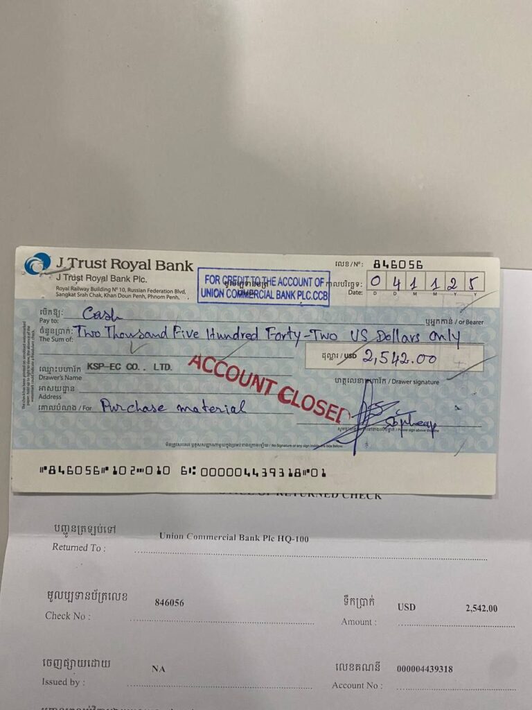 ក្រុមហ៊ុនបេតុងស៊ីម៉ង់ត៍ធំមួយ បានចេញសេចក្ដីជូនដំណឹងទៅកាន់ដៃគូរកស៊ី លោក គីម សុភាព អតិថិជនដែលបានជាវបេតុងស៊ីម៉ង់ត៍យកទៅចាក់សំណង់ផ្សេងៗ ដោយបានចេញសែក (មូលប្បទានប័ត្រ) សម្រាប់ទូទាត់ប្រាក់ ប៉ុន្តែក្នុងសែកនោះ អត់មានសាច់ប្រាក់ទេ (សែកស្អុយ) ធ្វើឱ្យក្រុមហ៊ុន មិនបានទទួលប្រាក់ ហើយការបង្វិលសាច់ប្រាក់ក៏ត្រូវគាំង ប៉ះពាល់ដល់ចរន្តការងាររបស់ក្រុមហ៊ុនដែរ ដូច្នេះសូមលោក រួសរាន់មកទូរទាត់ប្រាក់ ដែលនៅជំពាក់ក្រុមហ៊ុន ឱ្យបានលឿនទាន់ពេលវេលា តាមដែលអាចធ្វើទៅបាន មុនពេលដែលក្រុមហ៊ុនចាត់វិធានការផ្លូវច្បាប់។