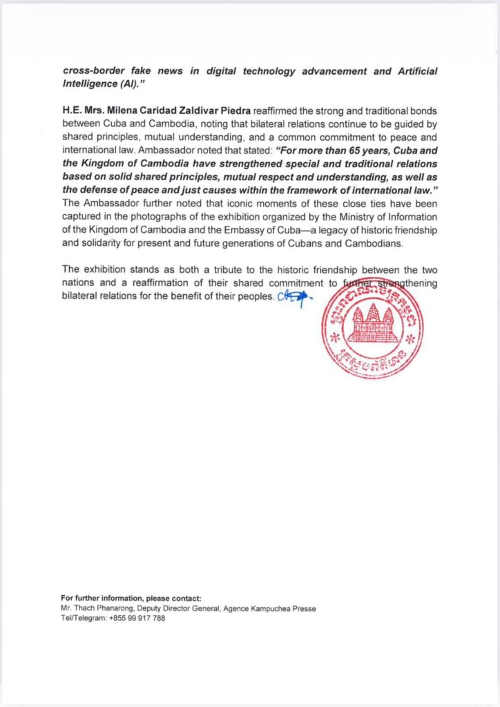 ឯកឧត្តមរដ្ឋមន្ត្រីបានមានប្រសាសន៍ថា “រូបថតដែលដាក់តាំងបង្ហាញនៅក្នុងការតាំងពិព័រណ៍នេះឆ្លុះ បញ្ចាំងពីប្រវត្តិសាស្ត្រ និងសមិទ្ធផលដែលកើតចេញពីទំនាក់ទំនងជិតស្និទ្ធរវាងប្រទេសយើងទាំងពីរ»។ នៅក្នុងបរិបទនៃកិច្ចសហប្រតិបត្តិការទ្វេភាគី ឯកឧត្តមរដ្ឋមន្ត្រីបានគូសបញ្ជាក់អំពីទំនាក់ទំនងដ៏រឹងមាំរវាង កម្ពុជា និងគុយបា នៅក្នុងវិស័យព័ត៌មាន ដោយផ្តោតជាសំខាន់លើការផ្លាស់ប្តូរព័ត៌មាន ការផ្សព្វផ្សាយ វប្បធម៌នៃប្រទេសទាំងពីរ និងការបណ្ដុះបណ្តាលជំនាញបច្ចេកទេសដល់អ្នកសារព័ត៌មាន។ ឯកឧត្តមបាន បង្ហាញពី «គោលជំហរដ៏រឹងមាំរបស់ក្រសួងព័ត៌មានក្នុងការពង្រឹងទំនាក់ទំនងជាមួយគុយបាឱ្យកាន់តែរឹងមាំ
