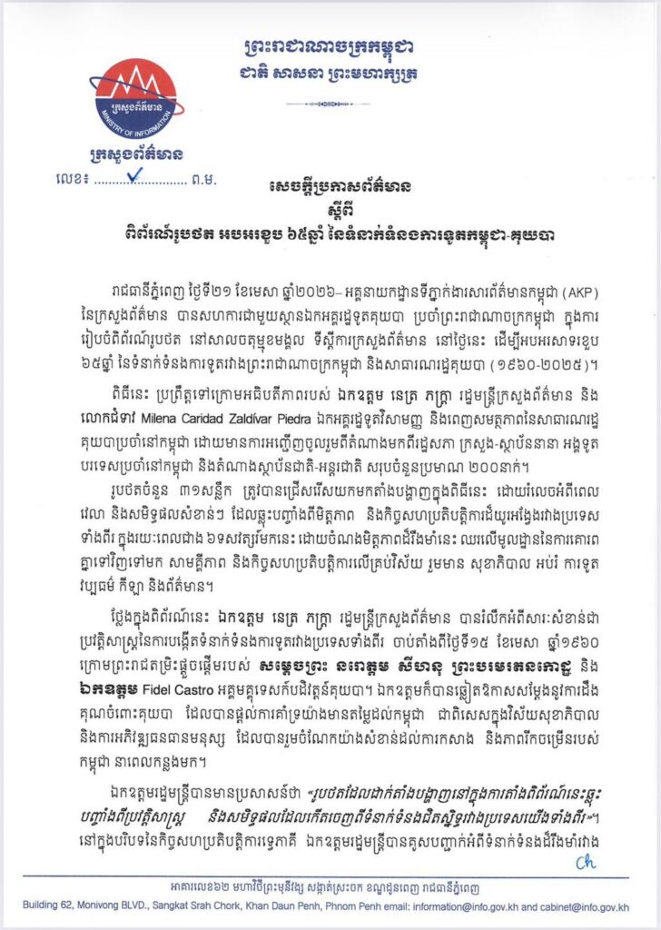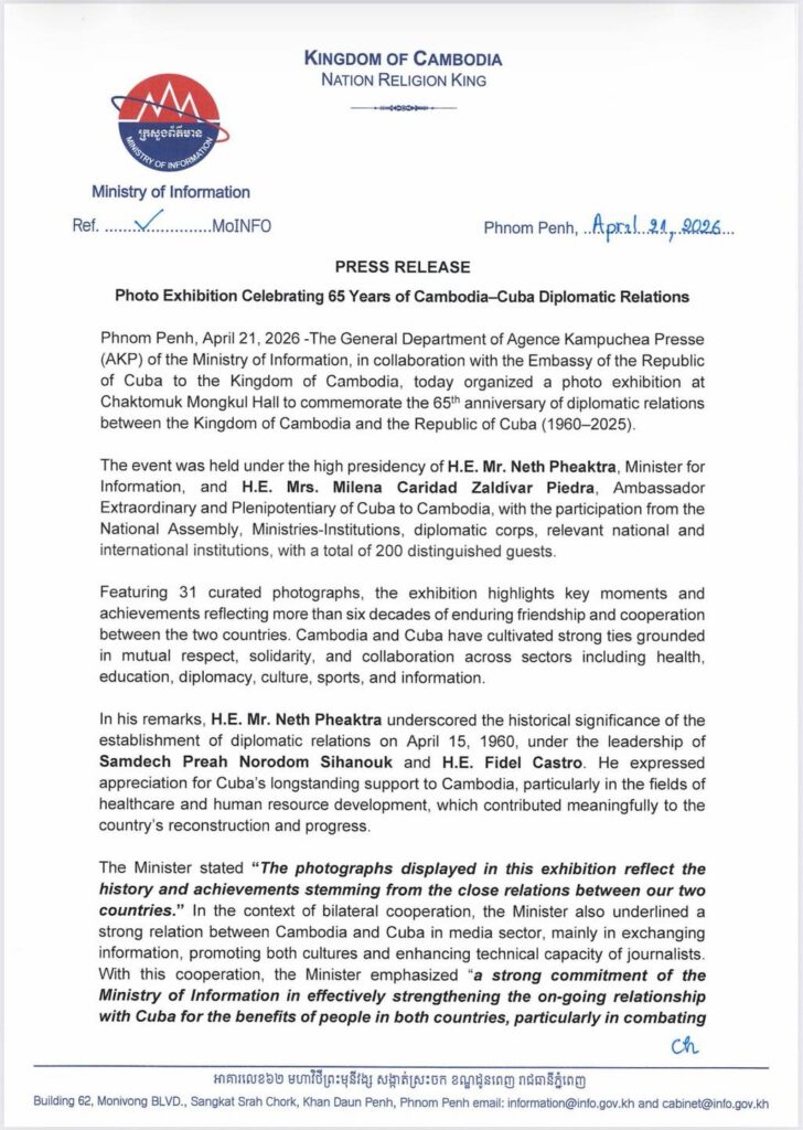 រាជធានីភ្នំពេញ ៖ ថ្ងៃទី២១ ខែមេសា ឆ្នាំ២០២៦ អគ្គនាយកដ្ឋានទីភ្នាក់ងារសារព័ត៌មានកម្ពុជា (AKP) នៃក្រសួងព័ត៌មាន បានសហការជាមួយស្ថានឯកអគ្គរដ្ឋទូតគុយបា ប្រចាំព្រះរាជាណាចក្រកម្ពុជា ក្នុងការ រៀបចំពិព័រណ៍រូបថត នៅសាលចតុម្មុខមង្គល ទីស្តីការក្រសួងព័ត៌មាន នៅថ្ងៃនេះ ដើម្បីអបអរសាទរខួប ៦៥ឆ្នាំ នៃទំនាក់ទំនងការទូតរវាងព្រះរាជាណាចក្រកម្ពុជា និងសាធារណរដ្ឋគុយបា (១៩៦០-២០២៥)។