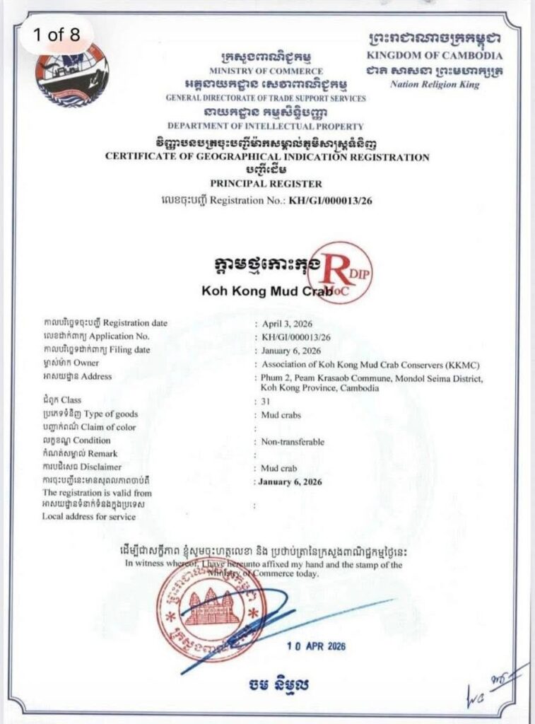 ក្តាមថ្មខេត្តកោះកុង ត្រូវបានចុះបញ្ជីម៉ាកសម្គាល់ភូមិសាស្រ្តបែបស្តង់ដារអន្តរជាតិហើយ ដោយបង្កើតជាសមាគមអភិរក្សាក្តាមលើកដំបូងទៀតផង។ ក្រសួងពាណិជ្ជកម្ម និងអង្គការដៃគូអភិវឌ្ឍន៍ បានសម្រេចដូចបំណងហើយ ដើម្បីឱ្យផលិតផលក្តាមថ្មនៅខេត្តកោះកុង ចុះបញ្ជីម៉ាកសម្គាល់ភូមិសាស្រ្តជាលក្ខណៈស្តង់ដារអន្តរជាតិ បន្ទាប់ប្រឹងប្រែងស្រាវជ្រាវកងច្រងអស់ពេលជាង៤ឆ្នាំមកនេះ ៕ រក្សាសិទ្ធដោយ៖សុទ្ធលី