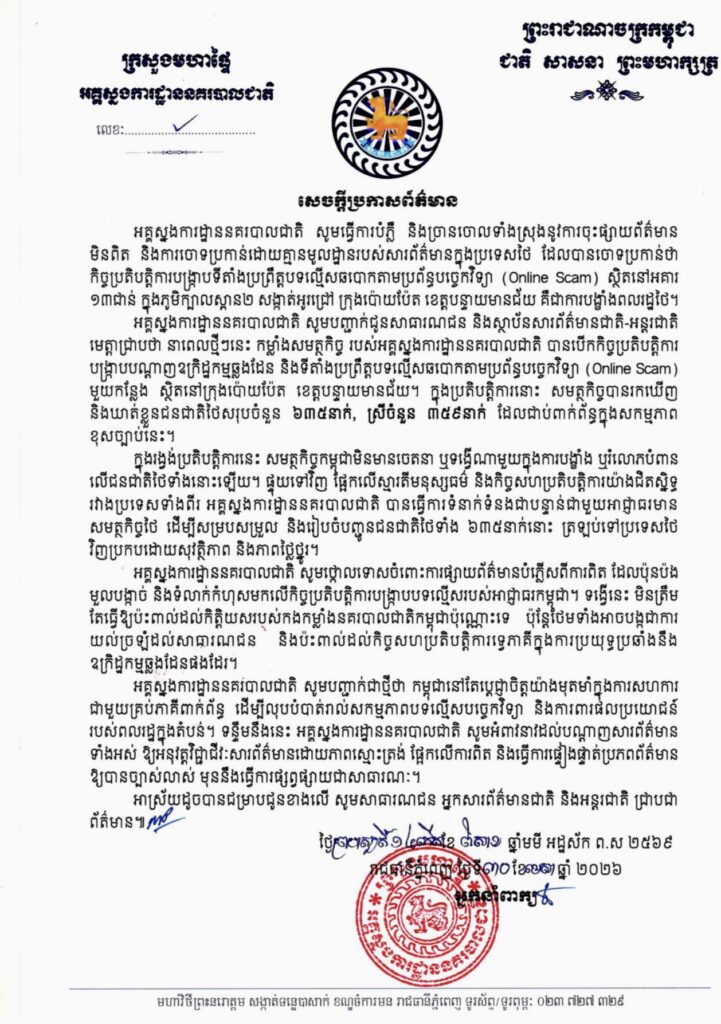នៅក្នុងសេចក្ដីប្រកាសព័ត៌មាន របស់អគ្គស្នងការដ្ឋាននគរបាលជាតិ ចុះថ្ងៃទី៣០ ខែមេសា ឆ្នាំ២០២៦ នេះ បានគូសបញ្ជាក់ថា អគ្គស្នងការដ្ឋាននគរបាលជាតិ សូមធ្វើការបំភ្លឺ និងច្រានចោលទាំងស្រុងនូវការចុះផ្សាយព័ត៌មានមិនពិត និងការចោទប្រកាន់ដោយគ្មានមូលដ្ឋានរបស់សារព័ត៌មានក្នុងប្រទេសថៃ ដែលបានចោទប្រកាន់ថា កិច្ចប្រតិបត្តិការបង្ក្រាបទីតាំងប្រព្រឹត្តបទល្មើសឆបោកតាមប្រព័ន្ធបច្ចេកវិទ្យា (Online Scam) ស្ថិតនៅអគារ ១៣ជាន់ ក្នុងភូមិក្បាលស្ពាន២ សង្កាត់អូរជ្រៅ ក្រុងប៉ោយប៉ែត ខេត្តបន្ទាយមានជ័យ គឺជាការបង្ខាំងពលរដ្ឋថៃ។